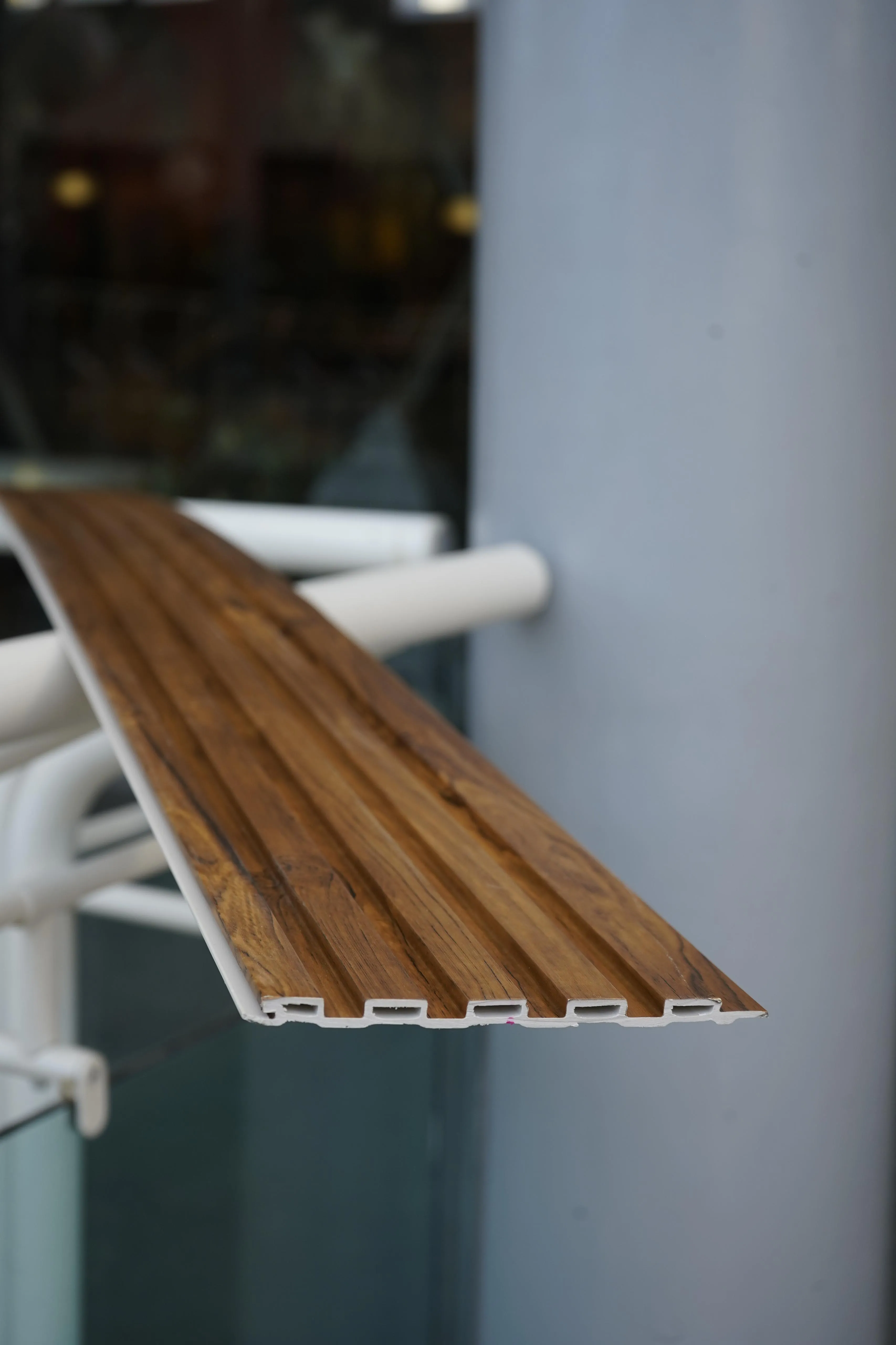 Panel listonado de WPC (Wood Plastic Composite) en tono Nogal. La profundidad y riqueza de la madera noble en un material duradero.