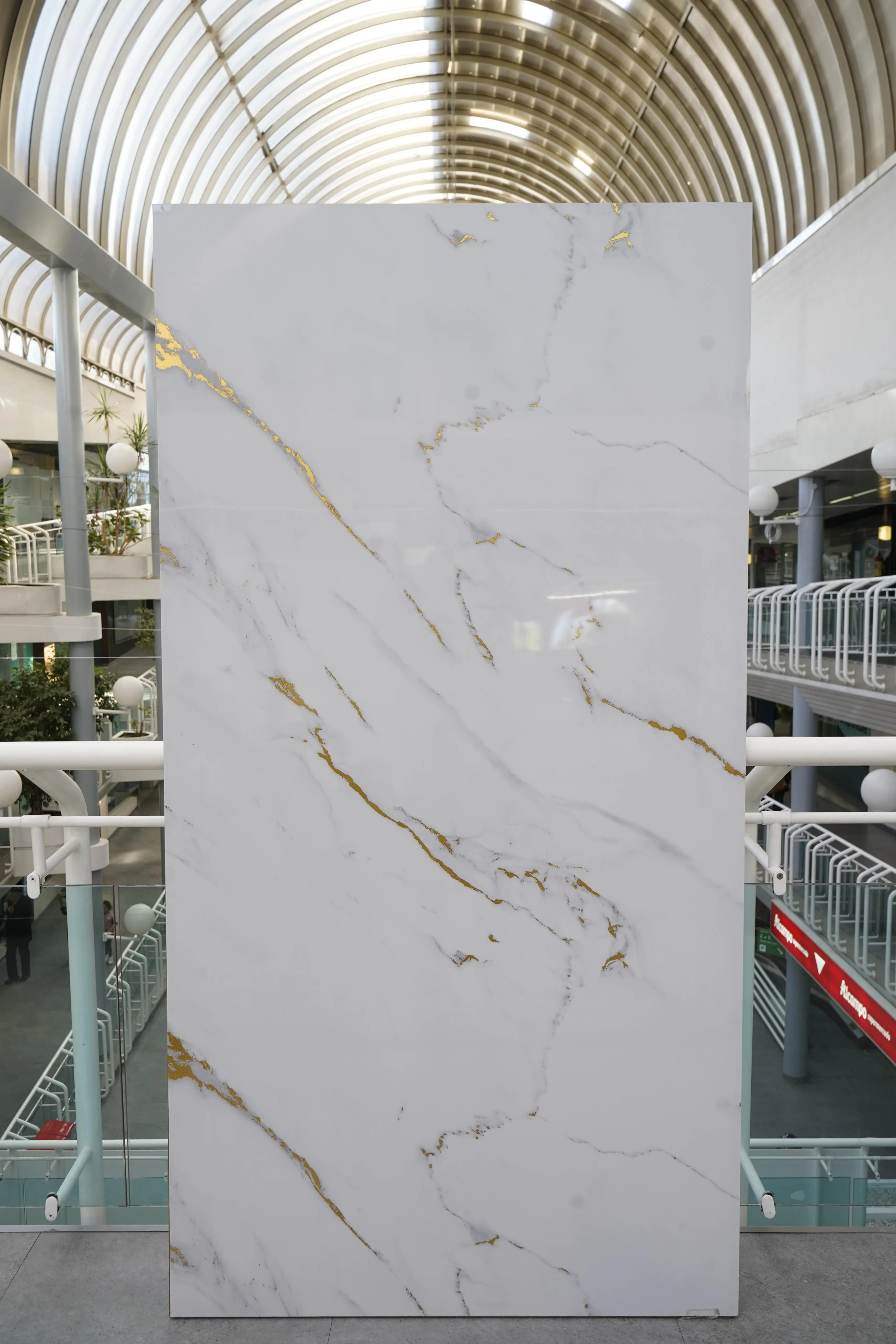 Placa de PVC con efecto mármol Calacatta Gold. Vetas doradas sobre fondo blanco puro para un acabado de máximo lujo.